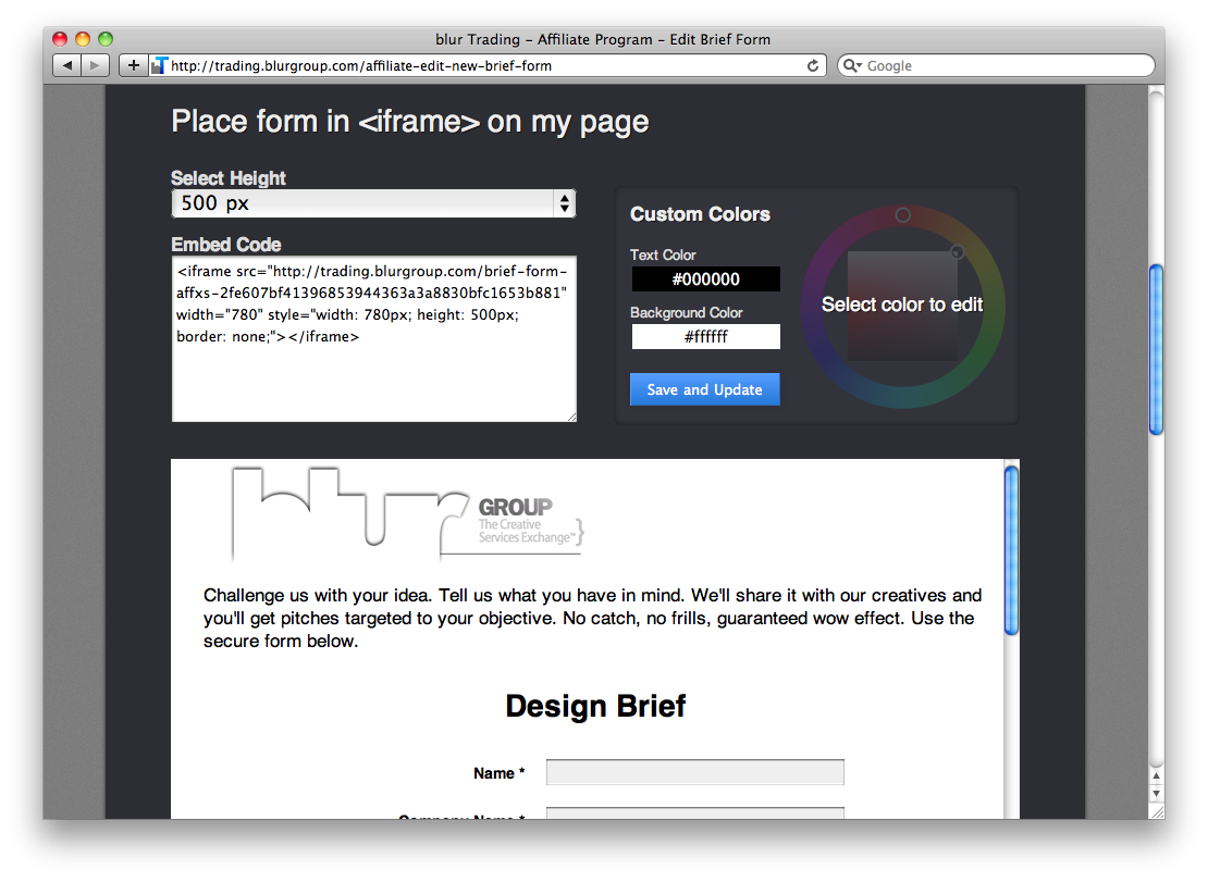 Although open to general website owners the ability to submit a brief will likely appeal to creative individuals or organisations who already operate a website. For example, if a graphic artist places the blur Group’s widget on their site other individuals who need a graphic artist for their project could submit their brief via that artist’s website.